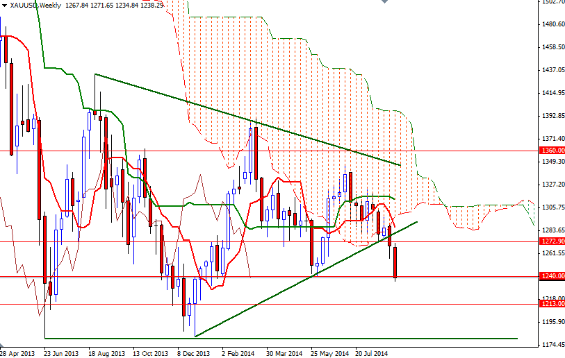 The recent price actions also confirms that there is more strength behind the bears than the bulls. Last week the XAU/USD pair broke below the ascending trend-line and also closed below the 1272.90 support level. In my previous analysis, I have been telling that the XAU/USD pair will resume its bearish sentiment as long as we continue to trade below the Ichimoku clouds on the weekly, daily and 4-hour time frames. The pair is currently trading behind the 1240 line which I see as a critical level and because of that I think the odds favor a further drop.