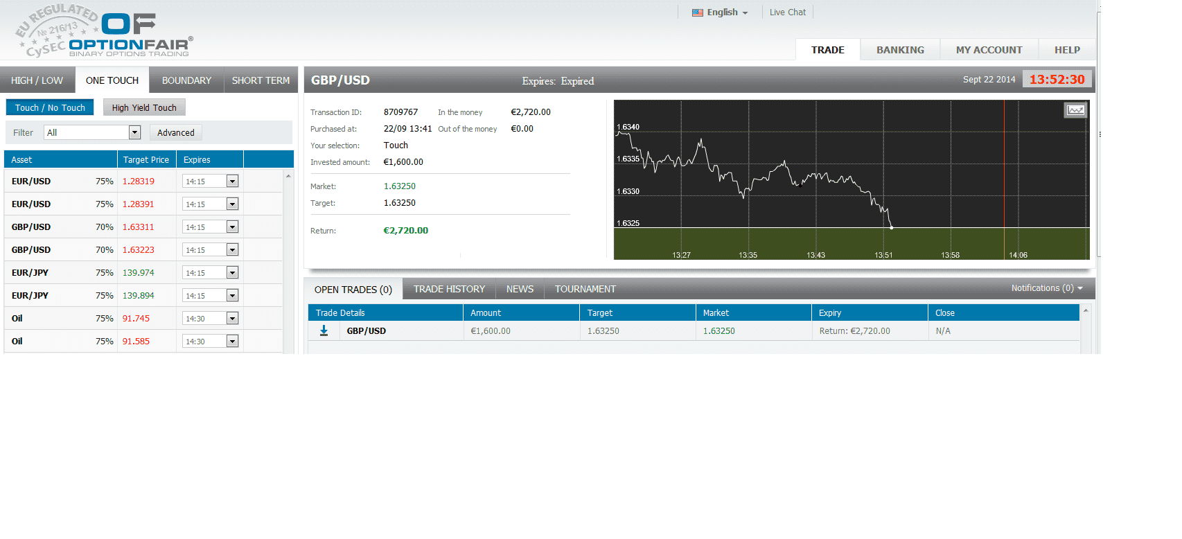 I logged in the OptionFair™ binary options trading platform and I traded $1600 on the "Touch Down" instrument. This kind of option has a return of 70% if the option touches the strike price prior to expiry, which means that if the signal is correct, I could get a return of $1120 on my investment.