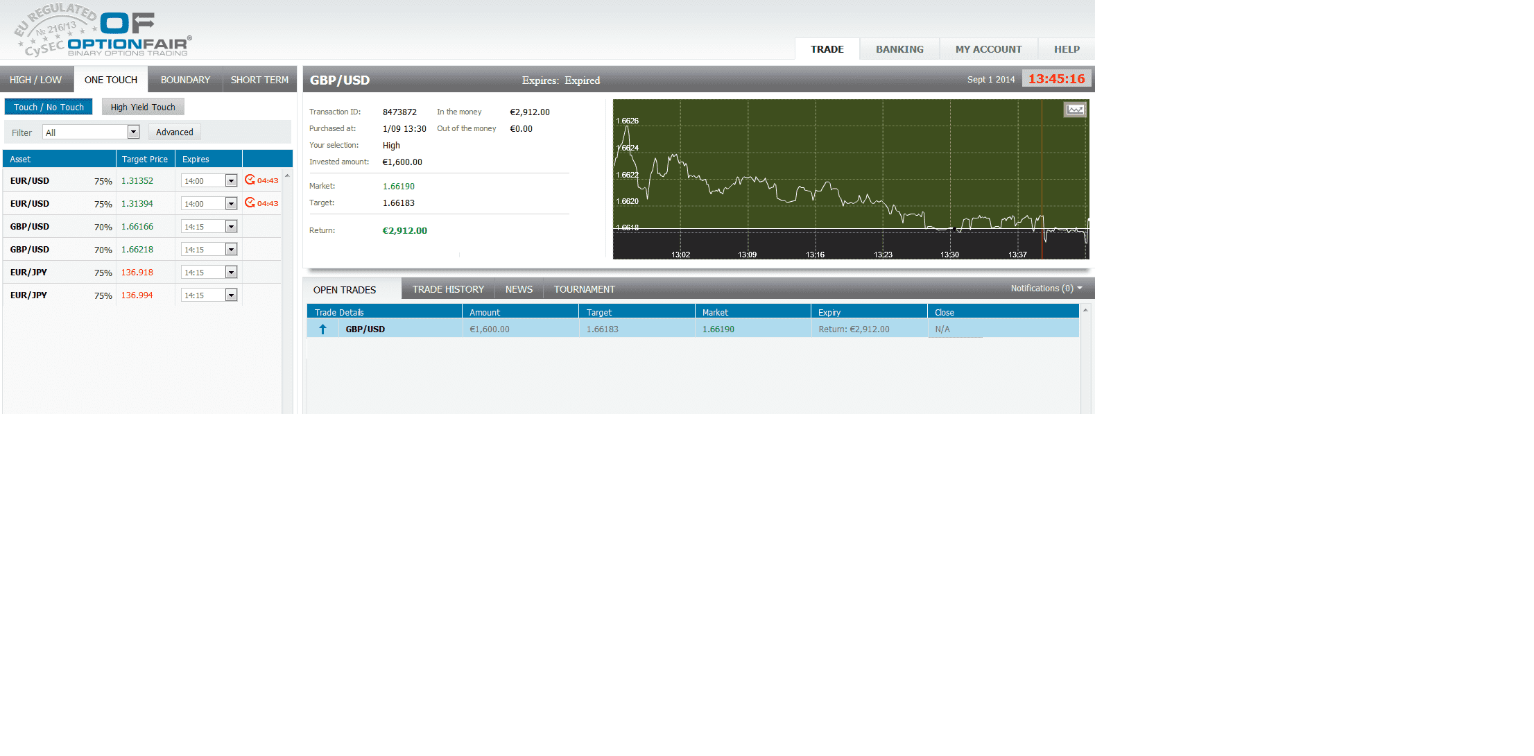 The target price for GBP/USD at the buying time (13:30) was 1.66183 for the expiration of 13:45. The Asset closed at 1.66190 and I made $1312.