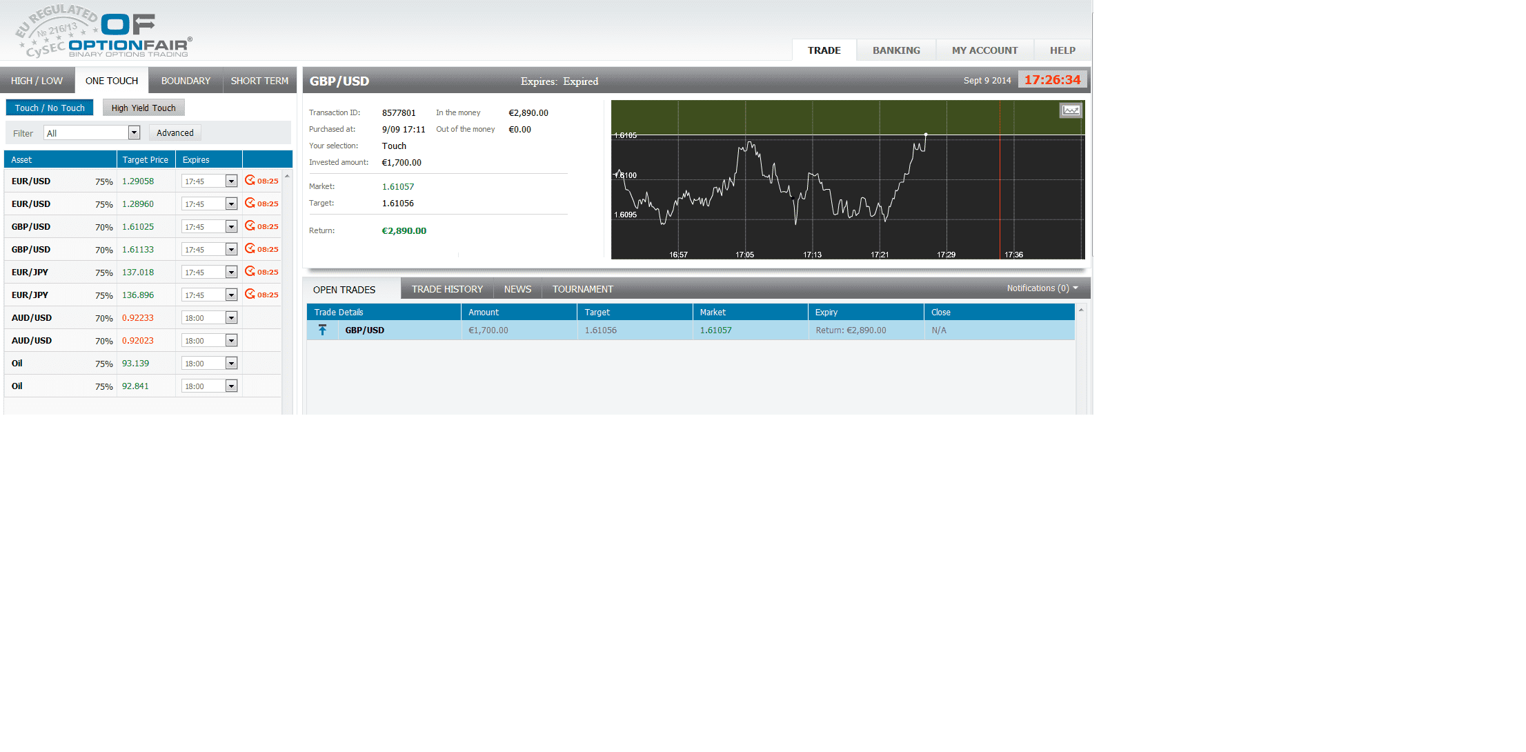 I logged in the OptionFair™ binary options trading platform and I traded $1700 on the "Touch Up" instrument. This kind of option has a return of 70% if the option touches the strike price prior to expiry, which means that if the signal is correct, I could get a return of $1190 on my investment.