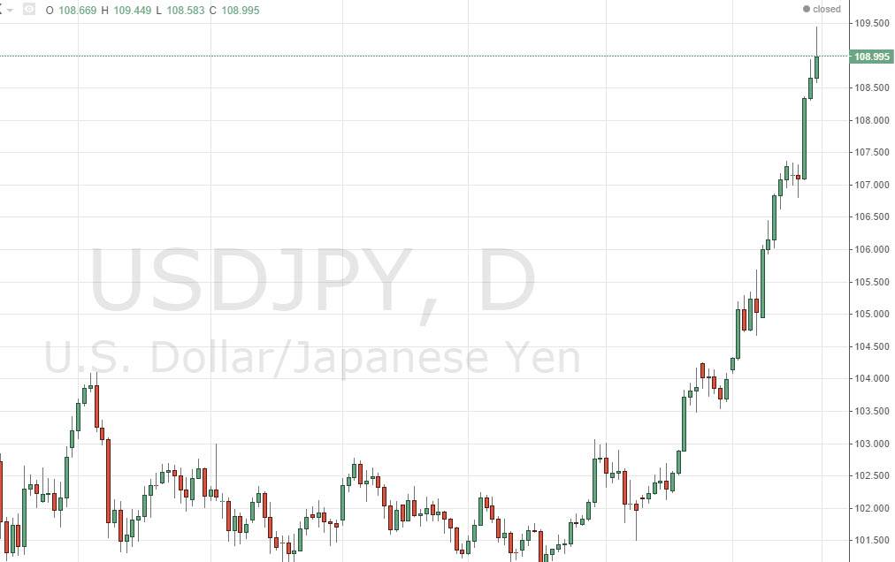 I do believe that ultimately we break above the 110 level, and I have to admit that I am a bit surprised that we’ve gotten this high in this short amount of time. This market is absolutely parabolic so what I’m waiting for is some sanity to come back in order to start buying. I think if you keep large stops when you get back involved in this market it becomes a longer-term buy-and-hold type of situation. Alternately, if we get above the 110 level, I think we continue a long-term uptrend. Every time this market dips, it should be an invitation to start buying again, just like the situation that we had several years ago back in the old “carry trade” days.