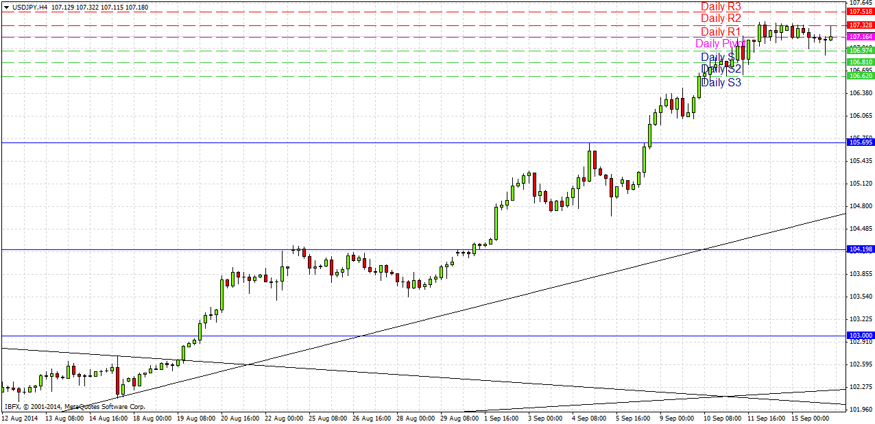 It is probably that nothing really will happen before the FOMC statement tomorrow evening. This might be the catalyst to drive the price down before it can rally again. Of course, it might just cause a spike higher. If that does happen, watch out for possible resistance at 107.50, which the market will probably see a key psychological number. In any case it is likely to clarify the situation and make the best next trade more obvious.