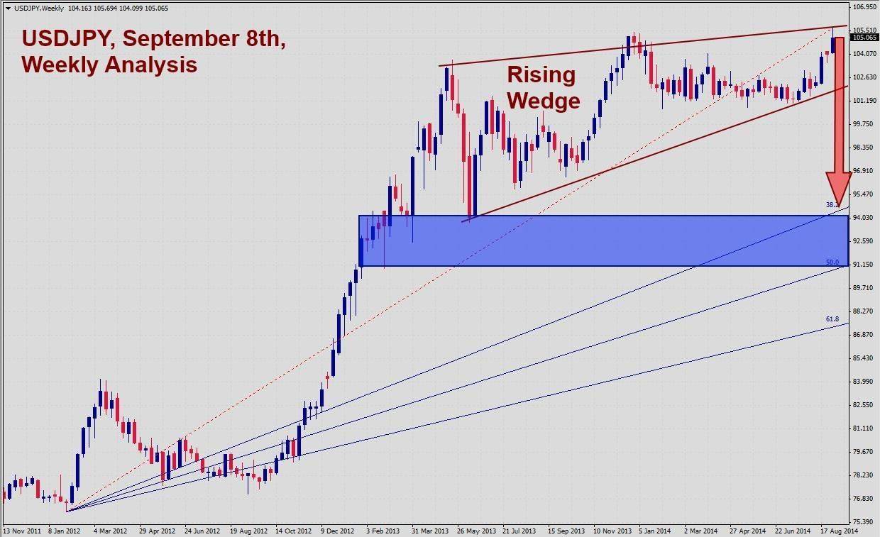 The USDJPY enjoyed a strong rally over the past 33 trading months. The sharp rally took this currency pair from an intra-day low of 76.021 to an intra-day high of 105.694 where the rally stalled and price action started to reverse. This currency pair has now formed a rising wedge formation and could exercise downward pressure on the USDJPY over the next few trading weeks.
