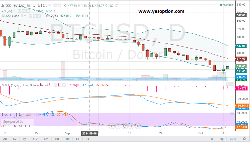 BTC/USD on the daily charts recovered from lower levels in yesterday’s trading session and continues to exhibit buying momentum in the Asian morning session. It is important to know that the BTC/USD hit an intraday low of $282 before bouncing back above the psychologically important level of $300. The BTC/USD continues to trade below its important daily moving averages. Resistance on the upside comes near the $362 level and support continues to be near the $300 level. The stochastic oscillator for the BTC/USD has given a fresh buy signal which is a bullish indictor. Similarly, the momentum indicator for the BTC/USD is showing signs of reversal which is being seen as a return of buy side momentum for the digital currency.
