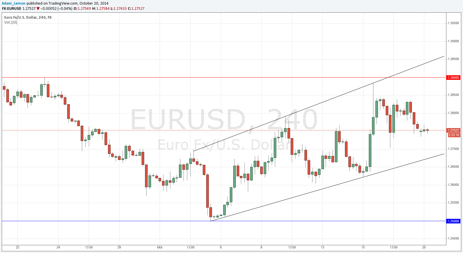 Since my last forecast some days ago, the EUR has been showing some unexpected bullishness across the board, as can be seen from a quick look at a chart of EUR/JPY for example. The H4 chart shown below shows not only a succession of higher lows following the strong move up from 1.2500, but also shows that we seem to be establishing a bullish channel. We have also recently broken or at least muddied the resistance zone that was previously established around the key psychological level of 1.2750. Therefore I am prepared to look for a long trade off the lower channel trend line if the price should fall there.