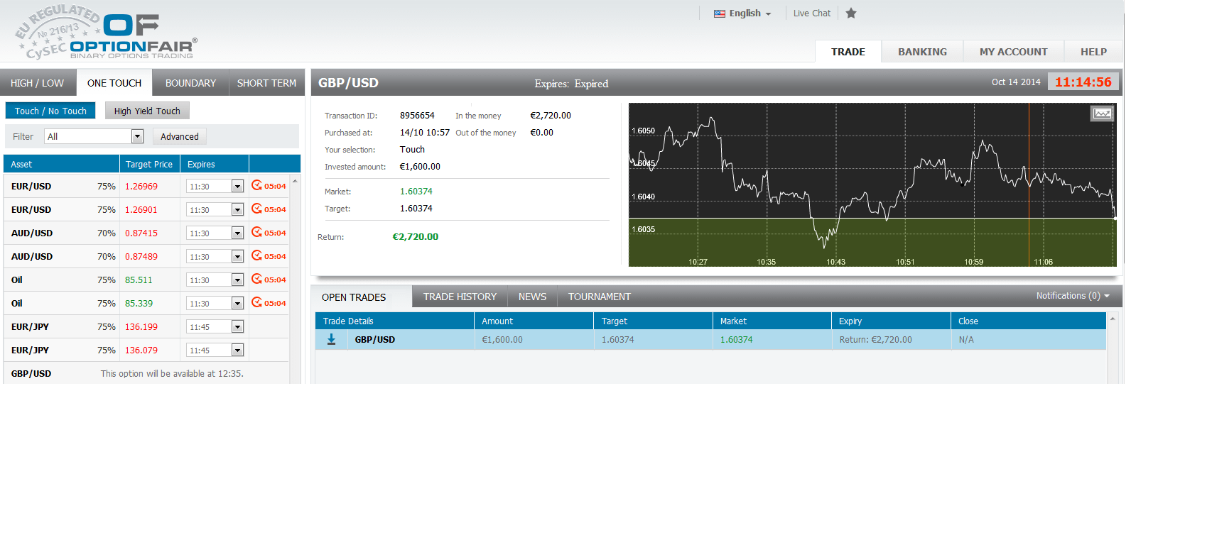 The price for GBP/USD at the buying time (10:57) was 1.60430 and the target price was 1.60374 for the expiration of 11:15. The asset touched my target price at 11:14 and I made $1120.