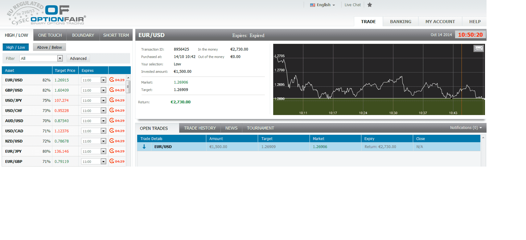 I logged in the OptionFair™ binary options trading platform and I traded $1500 on the "Low" instrument. This kind of option has a return of 82% if the option will close below the target price, which means that if the signal is correct I could get a return of $1230 on my investment.