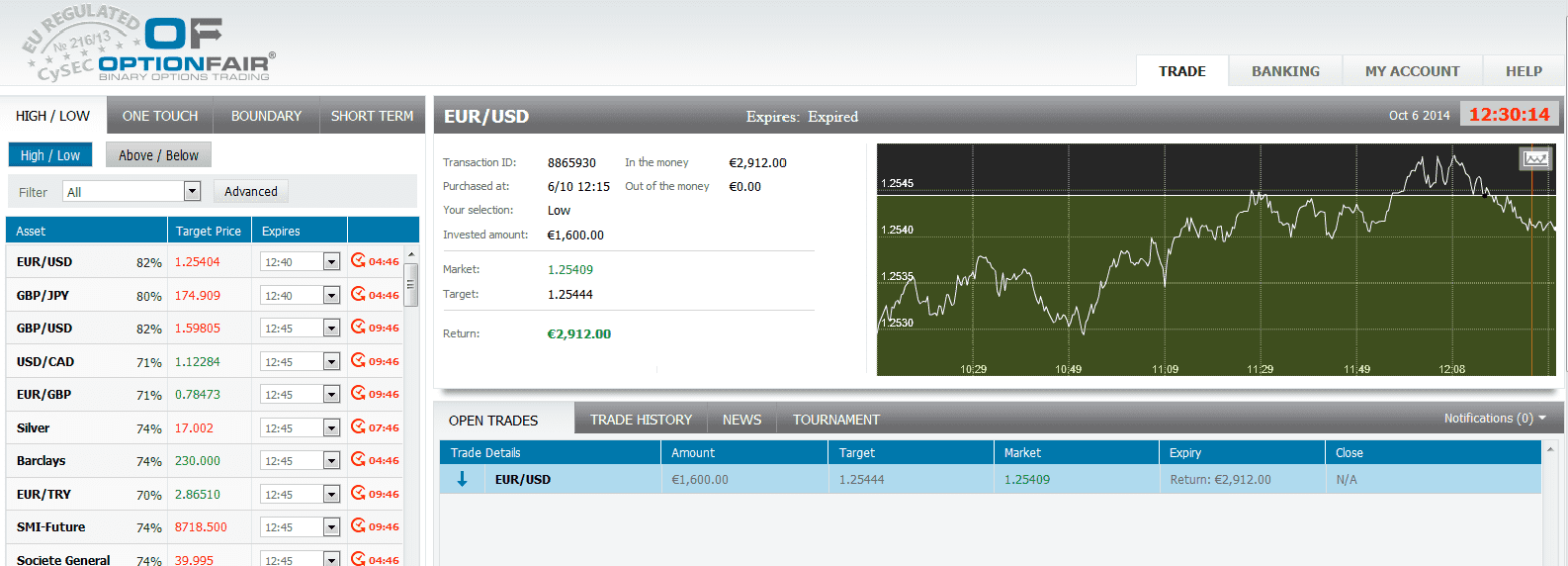 The target price for EUR/USD at the buying time (12:15) was 1.25444 for the expiration of 12:30. The Asset closed on 1.25409 and I made $1312.