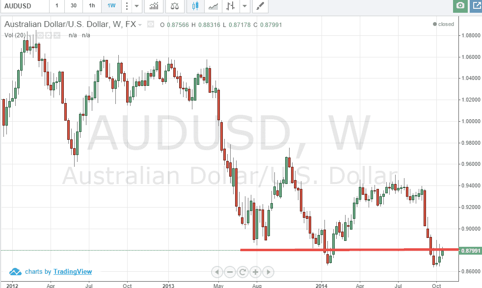 The AUD/USD trying to break out to the upside during the week, but as you can see struggled at the 0.88 resistance barrier yet again. Because of this, I believe that this market cannot be bought until we clear the 0.90 level, something that I do not see happening anytime soon. I believe this market will continue to have plenty of sellers step in and eventually push the Australian dollar down to the 0.85 handle, which is the next large, round, psychologically significant number.