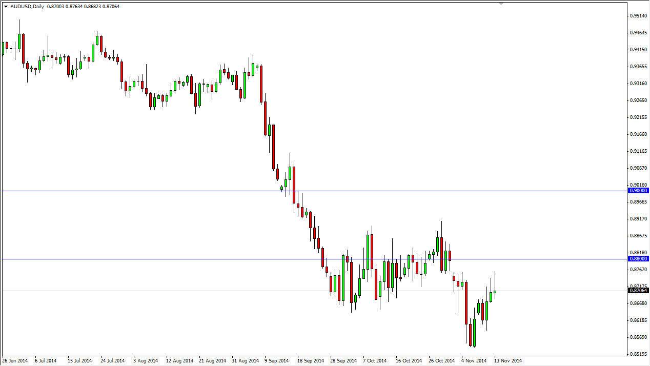 The US dollar is without a doubt the strongest currency that I am following right now, and it should continue to be. The market looks ready to continue to move in favor of that currency, which makes a lot of sense considering that the Federal Reserve is leaving the quantitative easing game. This has a massive effect on this market simply because it not only works against the value of the Australian dollar due to the fact that the US dollar is appreciating, but it also drags down the value of gold. In other words, it’s a bit of a “double whammy.”