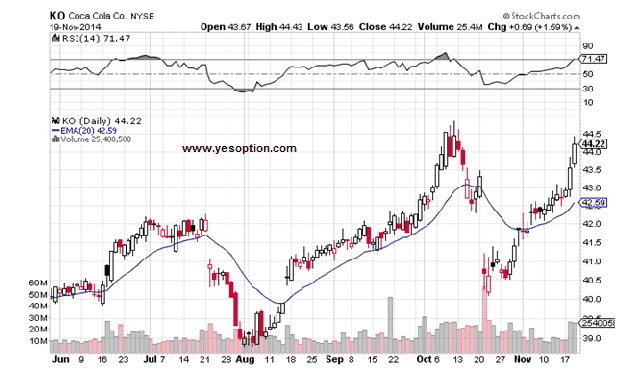 Coca-Cola’s daily chart is a perfect delight for any trader who is looking for trend and momentum. The stock has been making higher highs since the 20th of October. Going forward it looks very much like this upwards trend will continue, as long as it trades above its 20-Day EMA of $42.59. However, if any downwards trend were to commence, the stock would need to close in the negative for two consecutive days.