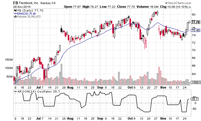 When looking at the daily chart, Facebook closed flat in Friday’s trading session at $77.70. The stock is currently trading above its 20-Day EMA of $75.40 and has been making higher-highs since the past few trading sessions. Its Aroon Oscillator stands at 35.7 and is moving up, indicating that an uptrend just commenced.