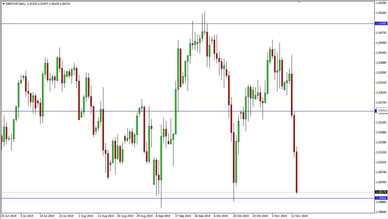 This is an area that has major support, so we want to see the buyers step in. In this general vicinity, any sign of support is a good risk to reward ratio trade as far as I’m concerned, because I think you could count on some type of move to the 1.5250 level if we do get a bounce. The other hand, we could break down from here and that of course would be a major sign of weakness. Either way, I think you are best served waiting for the daily candle to make your decision. If we break down, it’s going to be an excellent selling opportunity, but if we bounce is going to be an excellent buying opportunity. We could also consolidate in this area in a fairly tight range before making a decision, and that is why I prefer to wait for the daily close. Nonetheless, if we are going to see buyers step in this would be an excellent place.