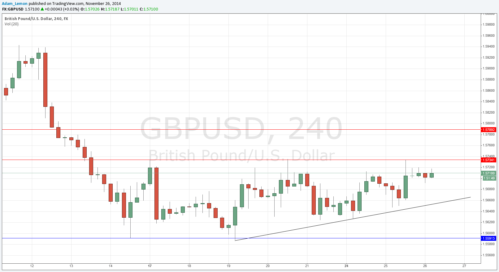 We saw continuing bullishness yesterday, although the price was not able to really get through the top of the range at around 1.5720. We see now a very slightly ascending triple top at around 1.5734, and an ascending bullish trend line below that is trying to push the pair upwards for a breakout. It looks likely that the next stop will be 1.5789.