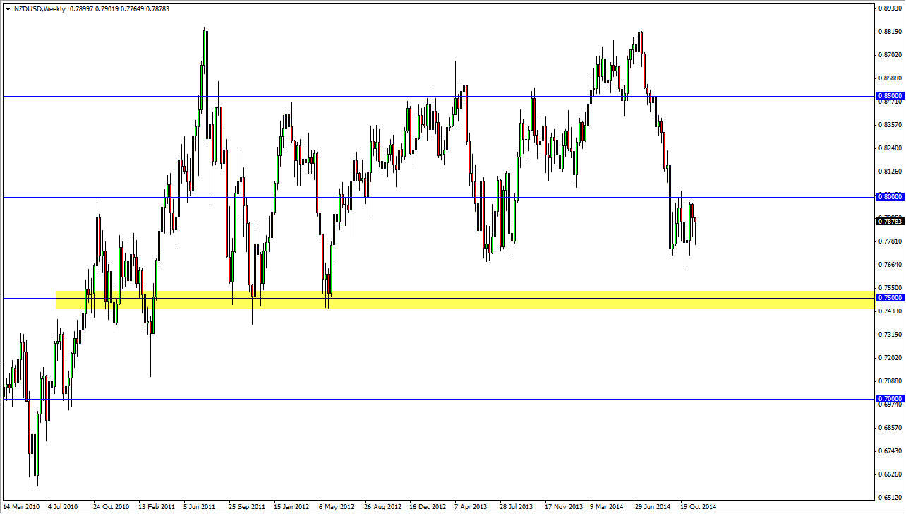 The NZD/USD pair has been grinding away sideways for some time now, as we bounced between the 0.77 level and the 0.80 level. With that, I believe that this market is simply taking a little bit of a rest after the significant sell off that we had seen previously. You can also see a massive red candle that sliced through the 0.80 handle, which is the Royal Bank of New Zealand flexing its muscles to keep the value of the Kiwi dollar down.