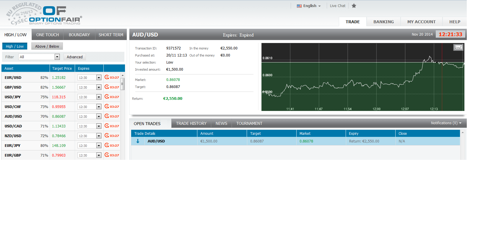 I logged in the OptionFair™ binary options trading platform and I traded $1500 on the "Low" instrument. This kind of option has a return of 70% if the option will close below the target price, which means that if the signal is correct I could get a return of $1050 on my investment.