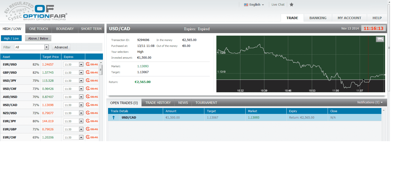 I logged in the OptionFair™ binary options trading platform and I traded $1500 on the "High" instrument. This kind of option has a return of 71% if the option will close above the target price, which means that if the signal is correct I could get a return of $1065 on my investment.