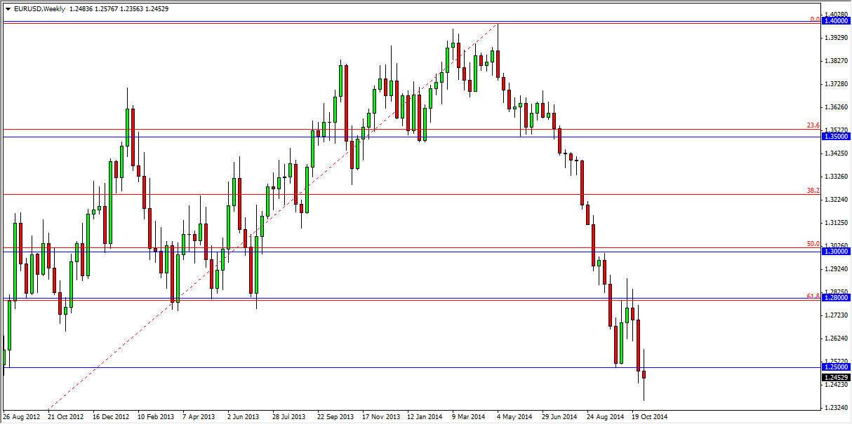 The EUR/USD pair had a very volatile week, hovering just below the 1.25 handle. I believe that this market is going lower, but there might be a bit of volatility to be had in this area. The girls, I am still selling this market as I believe the longer-term move is going to head to the 1.2050 level. That was the beginning of the move higher from several months ago, so we are simply going to do a “round-trip” in my opinion.
