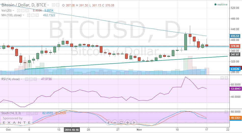 Short the BTC/USD if it moves below $371 for an intermediate target at $280, with a stop loss above $400.