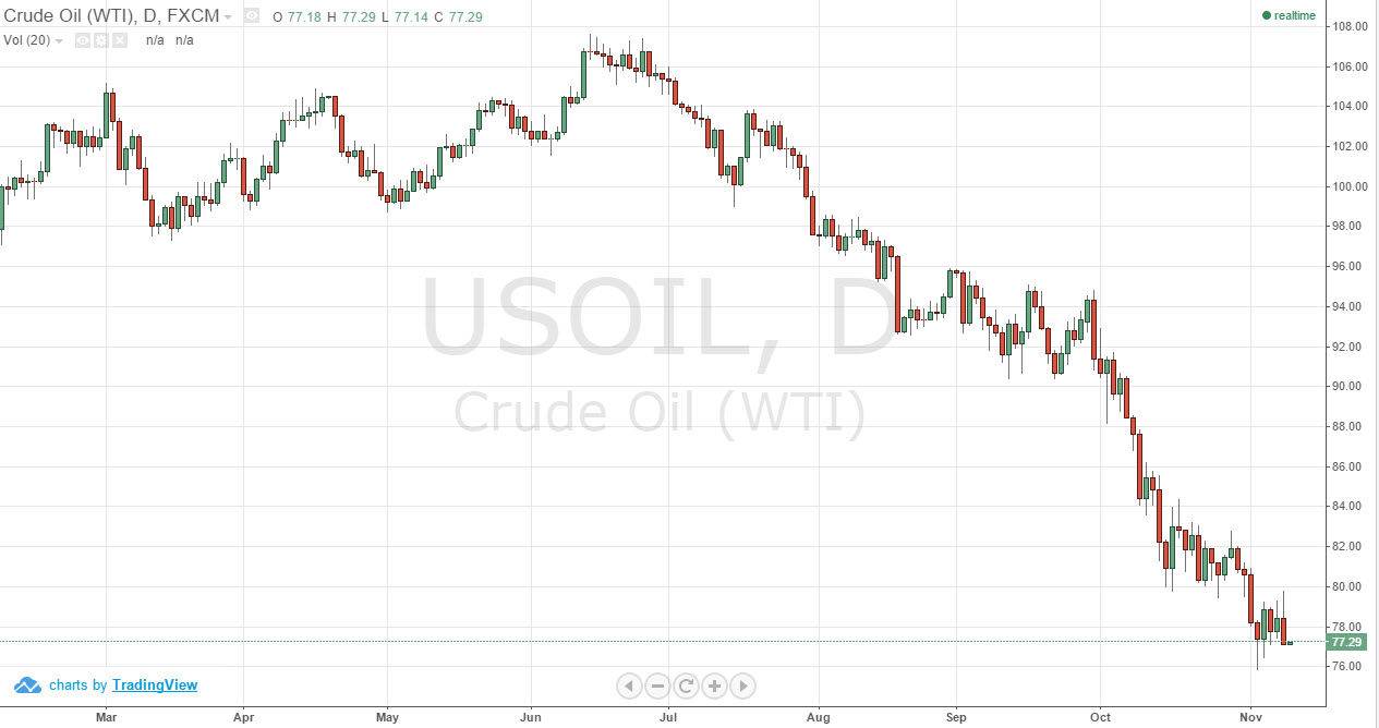 Looking at this chart, I think that we will go to at least the aforementioned $75 handle, and probably lower than that given enough time. I also think that it’s almost impossible to buy this market as the massive amount of resistance near the $80 level extends all the way to at least the $82 handle, and that means that it’s going to be very difficult for this market to change its mind and more importantly, a trend.