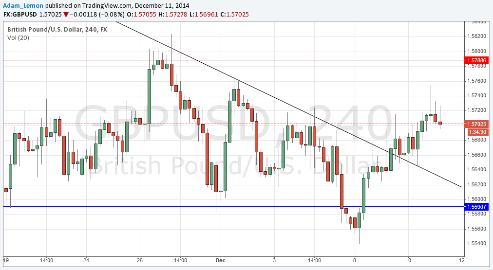 As we had broken up above the bearish trend line, I wrote yesterday that things looked bullish, but that there was a fair amount of choppy swing highs above 1.5700 that might make it hard to realy move up.