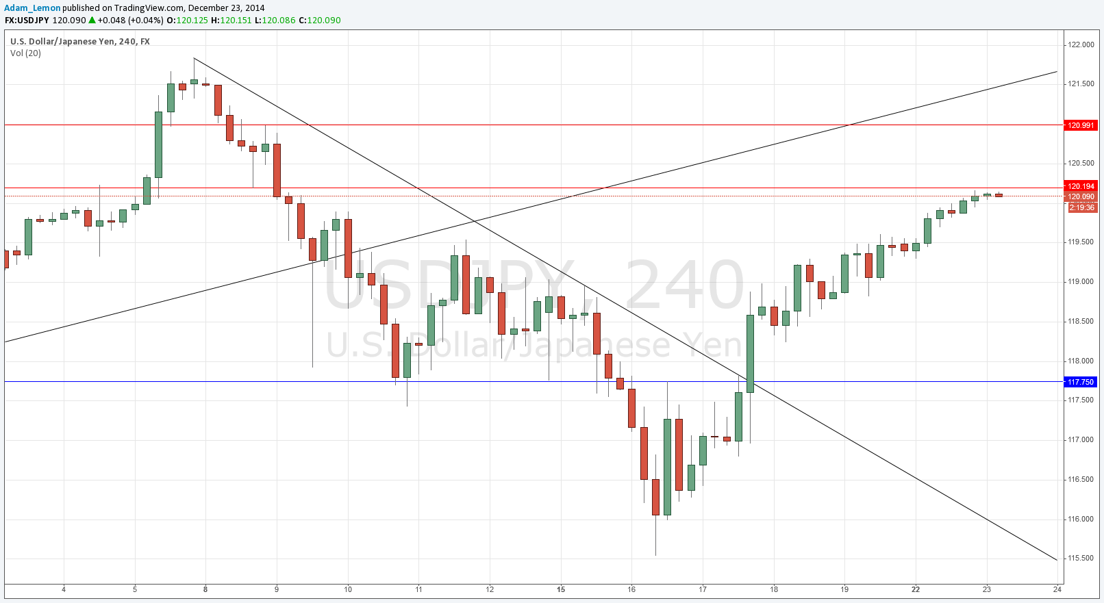 The USD had a little bullish run up starting at around the New York open yesterday, and it was most strongly expressed in this pair. The chart below shows a thin and very bullish pennant. The price is now very close to the 120.19 which I have been expecting to act as resistance, so a bearish bounce off this price on the H1 chart could be a good short trade if it happens quite soon. It is difficult to know where to take profit, so a conservative day trade would probably be the best option here.