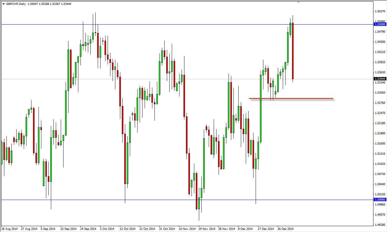 The GBP/CHF pair tested the 1.55 resistance region on Friday, and failed completely. In fact, this massive bearish engulfing candle almost ensures that we are going to go lower from here. As you can see on the chart, I have a red line drawn at the 1.5300 level, which I believe if we break below the pair will return to the 1.50 level given enough time. Rallies at this point in time will more than likely be selling opportunities as well, and I would not hesitate to sell the first resistant candle I see.