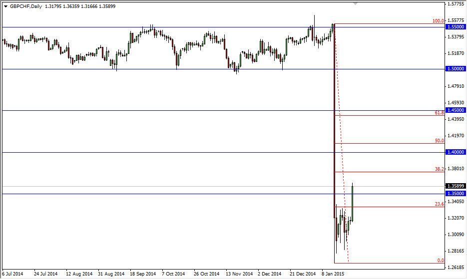 The GBP/CHF pair broke higher during the course of the day on Monday, and even managed to clear the 1.35 handle. Because of this, I have drawn the eighth Fibonacci retracement tool on the chart as well, trying to find some type of convergence. The 1.45 level is the 61.8% Fibonacci retracement level, or at least close to it, and of course a large, round, psychologically significant number. With that being said, I think we are probably going to go to that area, and one can only be described as a countertrend move of an oversold market.