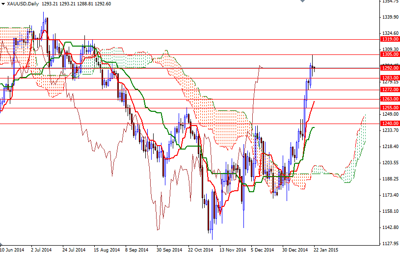 Gold prices settled lower on Wednesday as investors cashed in recent gains after the market failed to breach the $1305 resistance level. The XAU/USD pair initially rose during yesterday's session but we encountered selling pressure at the bottom of the weekly Ichimoku cloud. As a result, prices retreated to the $1283 support before bouncing back to $1292.