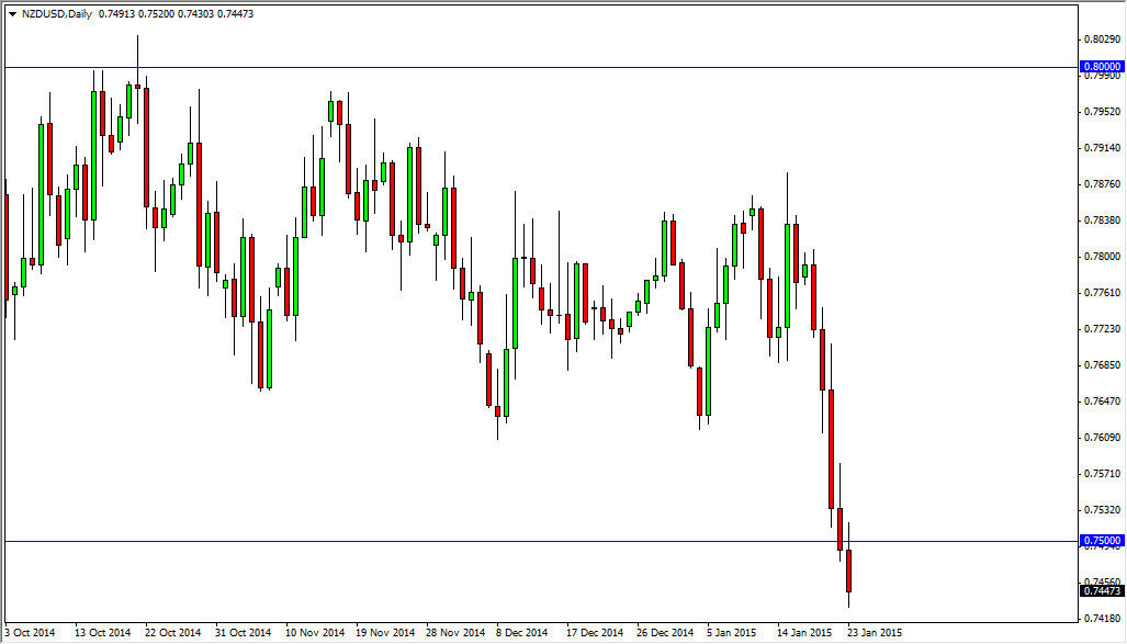 Looking at the longer-term charts, I believe that the 0.75 level is massive support, and it has in fact been broken. The Reserve Bank of New Zealand continues to try to talk the value the Kiwi dollar down, waiting for a move as low as 0.68 which of course is what they believe it is fair value. Because of this, I believe that there will continue to be pressure on the Kiwi dollar in general, and compounded with the fact that the US dollar is so strong, this pair can only go down overall in my opinion.