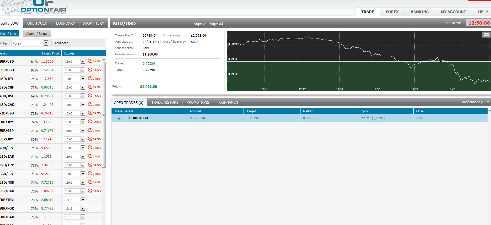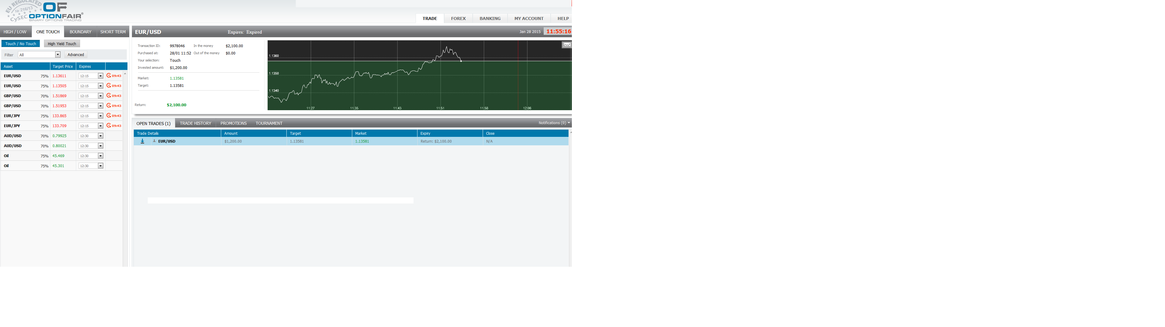 I logged in the OptionFair™ binary options trading platform and I traded $1200 on the "Touch Down" instrument. This kind of option has a return of 75% if the option touches the strike price prior to expiry, which means that if the signal is correct, I could get a return of $900 on my investment.