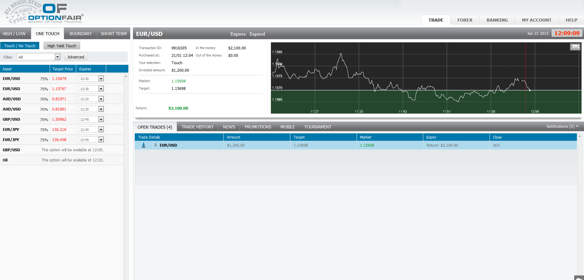 I logged in the OptionFair™ binary options trading platform and I traded $1200 on the "Touch Down" instrument. This kind of option has a return of 75% if the option touches the strike price prior to expiry, which means that if the signal is correct, I could get a return of $900 on my investment.