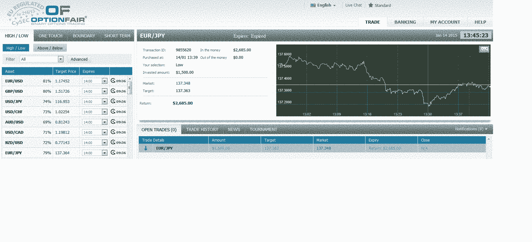 I logged in the OptionFair™ binary options trading platform and I traded $1500 on the "Low" instrument. This kind of option has a return of 79% so if the option will close below the target price, which means that if the signal is correct I could get a return of $1185 on my investment.