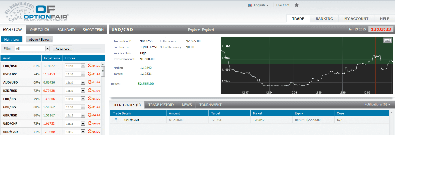 I logged in the OptionFair™ binary options trading platform and I traded $1500 on the "High" instrument. This kind of option has a return of 71% if the option will close above the target price, which means that if the signal is correct I could get a return of $1065 on my investment.