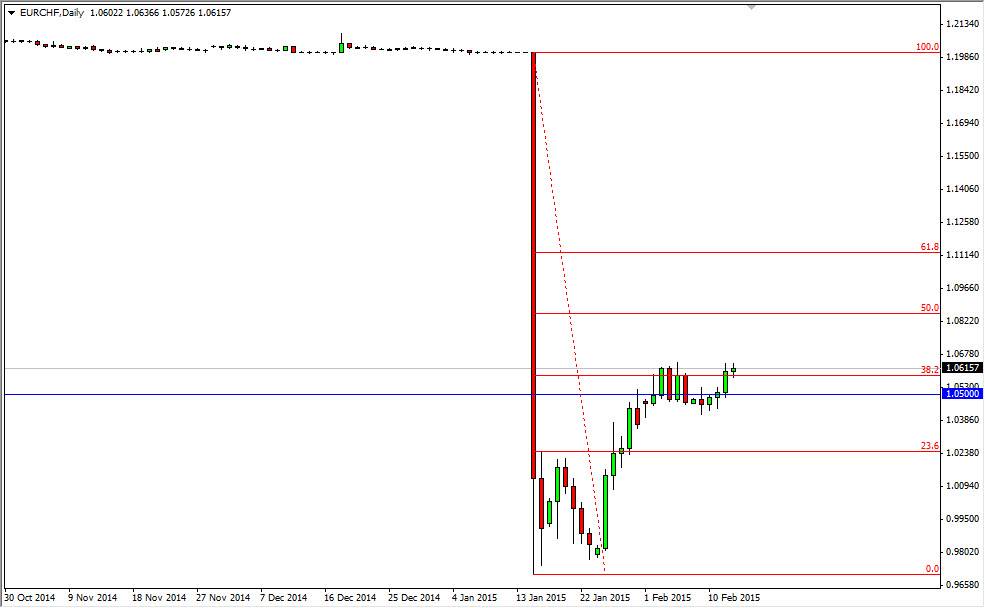 The EUR/CHF pair had a very quiet session on Friday, as we continue to press the top of the recent consolidation which is just above the 1.05 handle. Remember, this is a market that sold off rather viciously after the Swiss National Bank removed the currency peg at the 1.20 handle. With that, the bottom fell out and the market dropped all the way down to the 0.9650 region. That was truly an astronomical move, and somebody somewhere got very wealthy while so many others got wiped out.