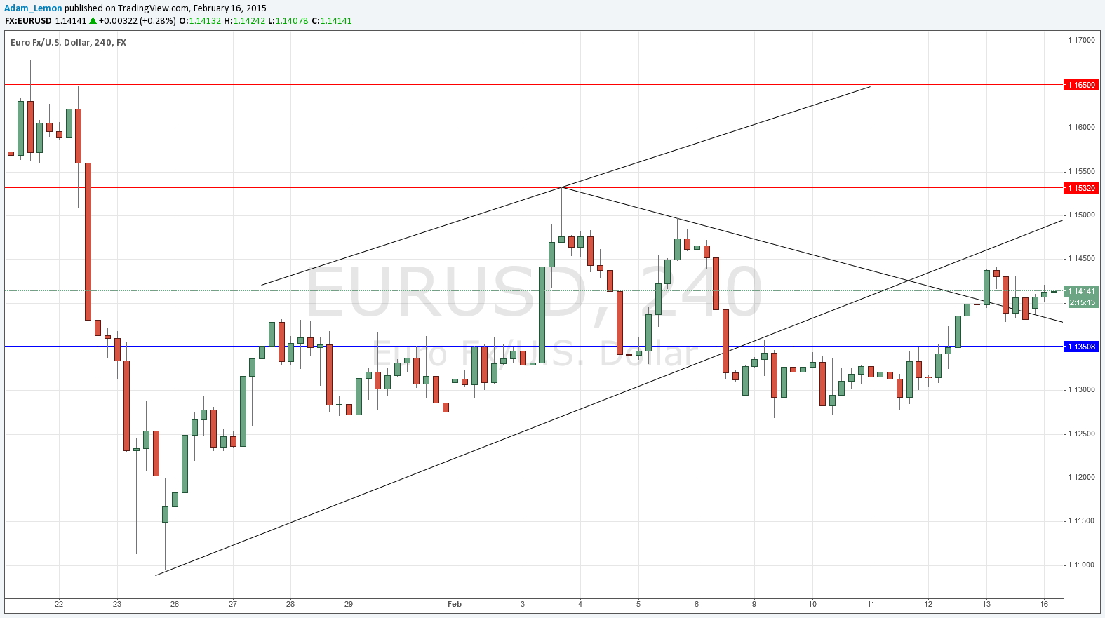 Towards the end of last week the market was waiting for bad news from the Euro zone that was expected to make the Euro drop and the price of this pair fall. Although there was no announcement of an agreement between Greece and the ECB, there was a strong rumour of a deal being cooked up behind the scenes, and this was actually enough to make this pair break upwards past resistance at 1.1350. Since then, we have also broken out above the bearish channel.