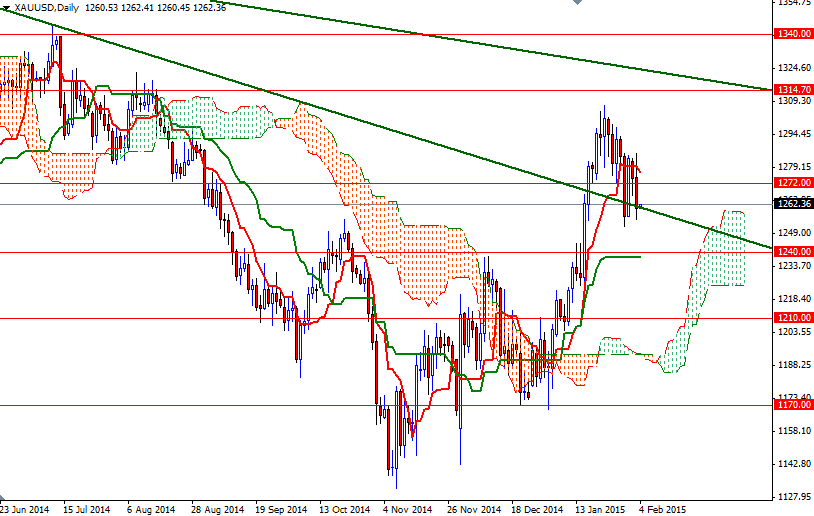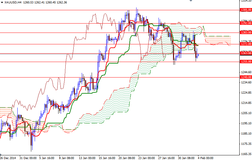 The XAU/USD pair initially tried to pass through the 1283 resistance level found enough resistance to reverse and drop below the 1263 level. As a result, the market tested the support at 1255. The pair gives us a mixed picture as prices remain different sides of the Ichimoku clouds on the daily and 4-hour charts. We have bullish Tenkan-sen (nine-period moving average, red line) - Kijun-sen (twenty six-day moving average, green line) cross on the weekly and daily charts but in order to gain an upward momentum prices will have to climb above the 1292 level. On its way up, expect to see resistance at 1270.70/1272 and 1283.