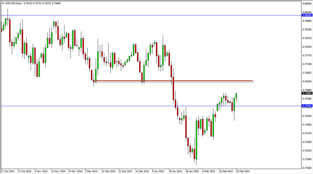 The NZD/USD pair initially fell during the session on Wednesday, but as you can see turned things back around to form a hammer. That being the case, the market looks as if it is ready to continue going higher, but I suspect that there is a significant amount resistance at the 0.7650 level. That was an area of significant support previously, so would not surprise me at all if we see selling pressure in that area. I also see significant support near the 0.74 handle, so at this point in time it’s difficult to imagine this market moving too quickly. I think in the short-term we will go higher, but I am actually more impressed by selling this market if we get a resistant candle just above.