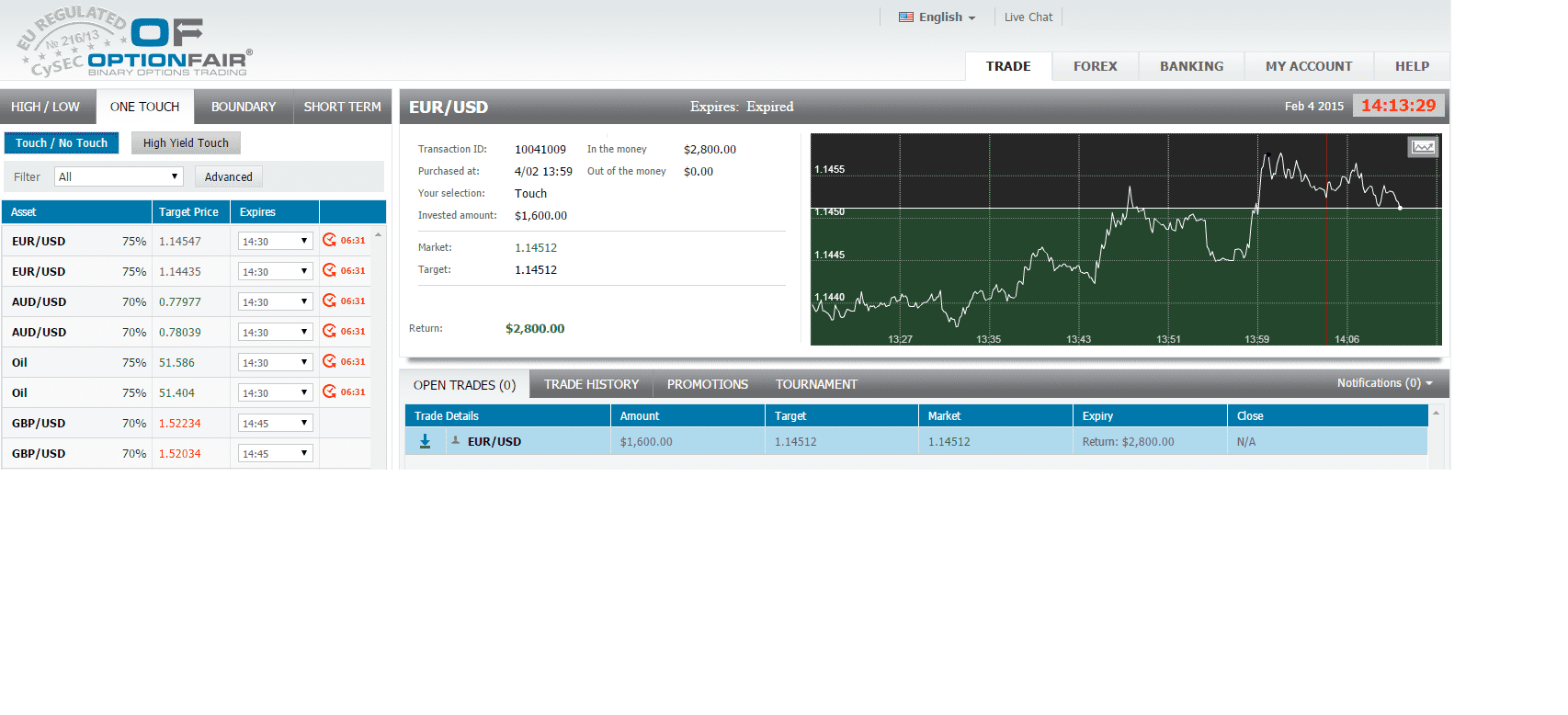 I logged in the OptionFair™ binary options trading platform and I traded $1600 on the "Touch Down" instrument. This kind of option has a return of 75% if the option touches the strike price prior to expiry, which means that if the signal is correct, I could get a return of $1200 on my investment.