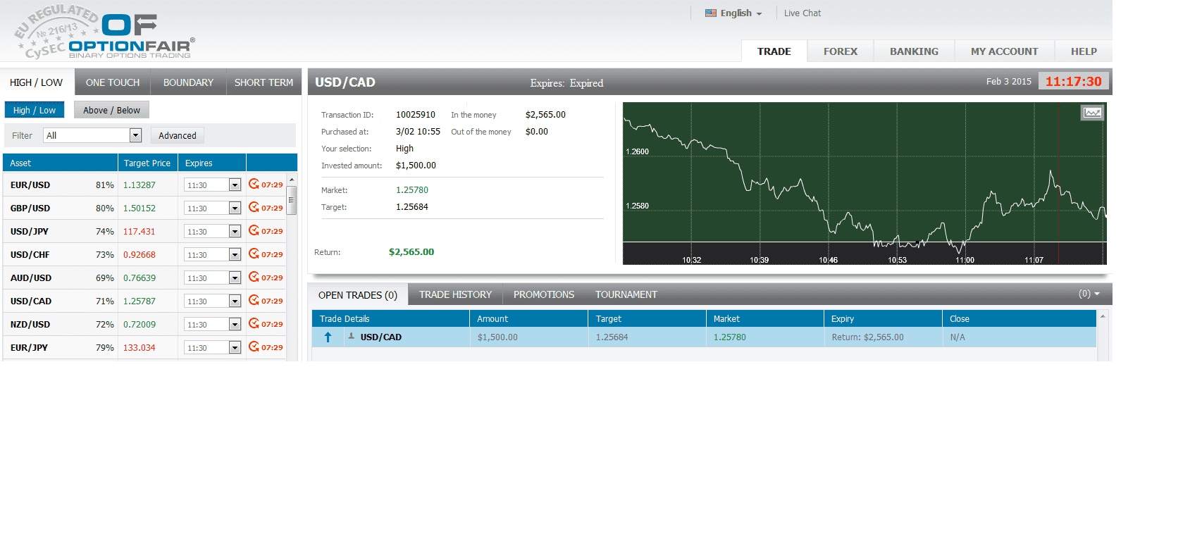 I logged in the OptionFair™ binary options trading platform and I traded $1500 on the "High" instrument. This kind of option has a return of 71% if the option will close above the target price, which means that if the signal is correct I could get a return of $1065 on my investment.