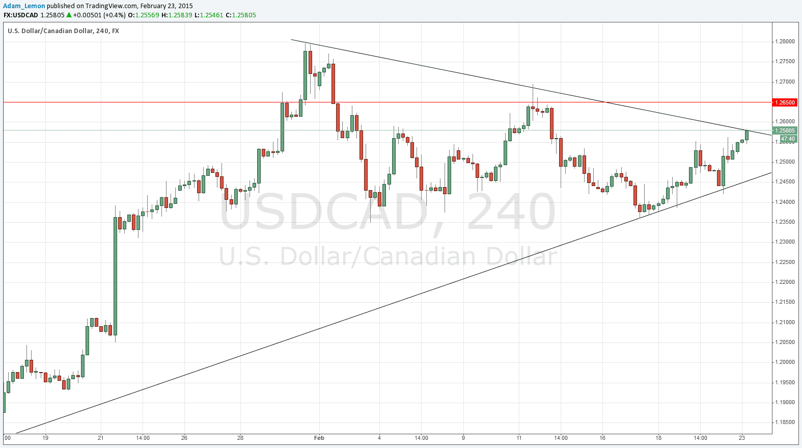 The chart below shows that long-term bullish trend line as the lower border of a consolidating, narrowing triangle that the price has remained within. At the time of writing, the upper border, which is the bearish trend line commencing at the recent multi-year high just below 1.2800, is being testing by the price which is now threatening to break above it.