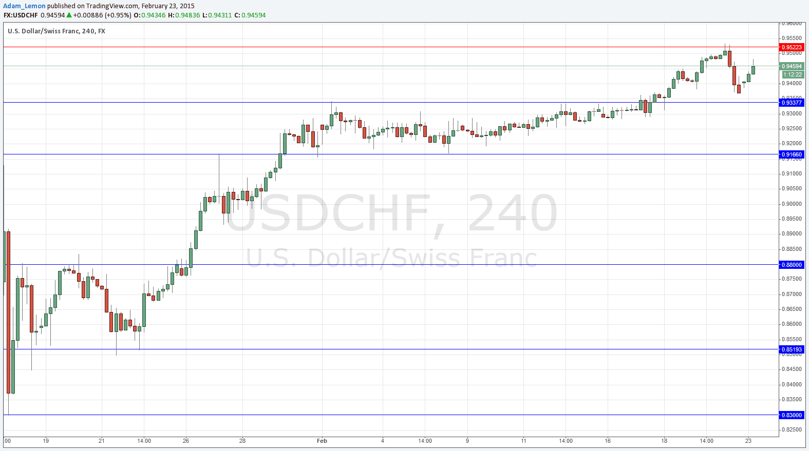 After spending more than 2 weeks consolidating, the price finally broke up past key resistance at 0.94 and appeared to be set for the CHF to continue its strong post-shock price rise. However, the pair seems to have hit previous support turned into resistance confluent with the key psychological number of 0.9500, and it finished the week reversing strongly from its high of 0.9534. I see the key level as at 0.9522 and would look for a short there even if the price manages to return to this level later today.