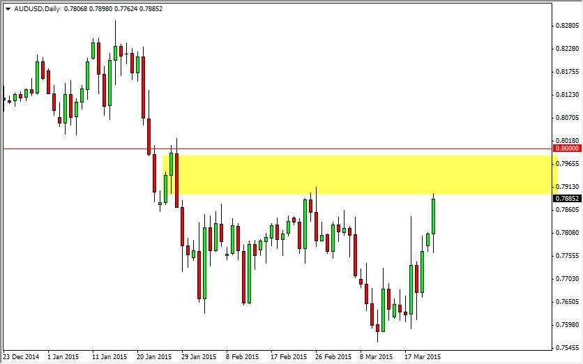 I still believe that selling rallies will be the way to go in this marketplace, as signs of weakness will return. At that point in time, I would anticipate the market heading back down to the 0.76 level, which of course is the most recent low. Whether or not we can get below that area is a completely different question, but at this point in time I believe that the Australian dollar is just simply taking a breather from the massive selloff. I believe that ultimately the market will break down below the 0.76 handle, but it might be weeks before we get below there. Expect quite a bit of resistance at the 0.80 handle, as it was once a massive resistance barrier in the past. It was also very supportive back in January, so of course it would make sense to have market memory come to play in that area. Ultimately, I believe that buying the Australian dollar is to simply going to be too difficult.