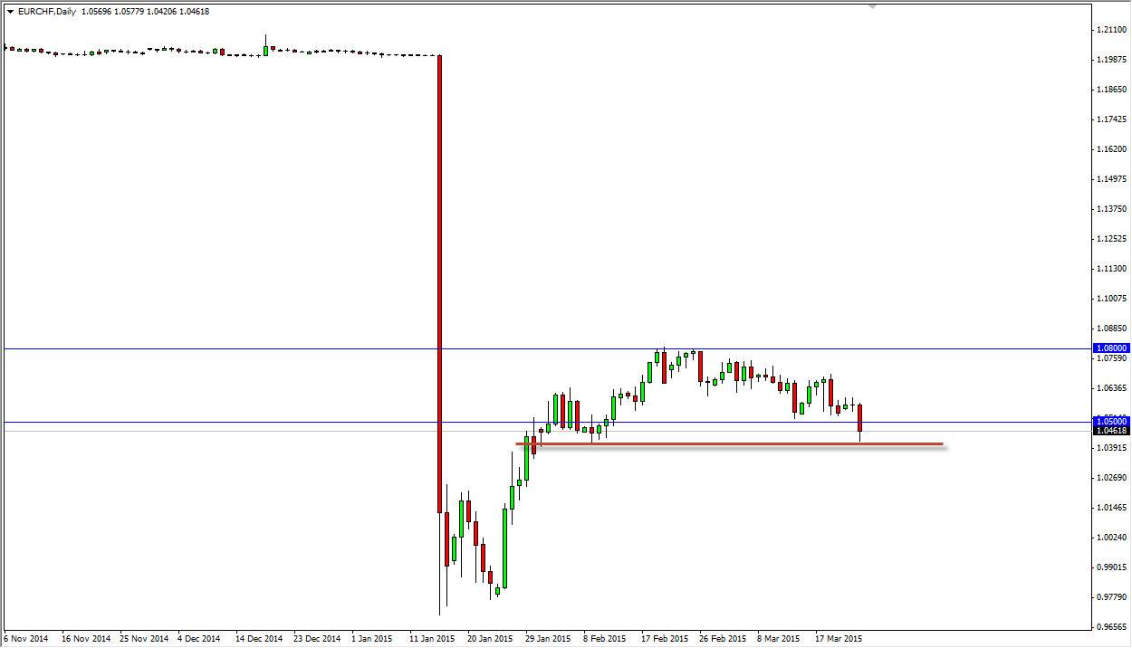 The EUR/CHF pair broke down during the course of the session on Tuesday, breaking below the 1.05 level. However, as you can see on the attached chart that there is a significant amount of support just below. That’s essentially were the market bounced from, and as a result I feel that if we can break down below the lows of the range, this would be a nice selling opportunity as it would be a continuation of the massive bearish trend that we have seen recently. I believe that the Euro continues to suffer overall, and it most certainly looks soft at this moment against most currencies, as we have formed to shooting stars in several different markets such as the EUR/USD and the EUR/JPY pairs. Normally when you see this, you will see the currency fall all across the board.