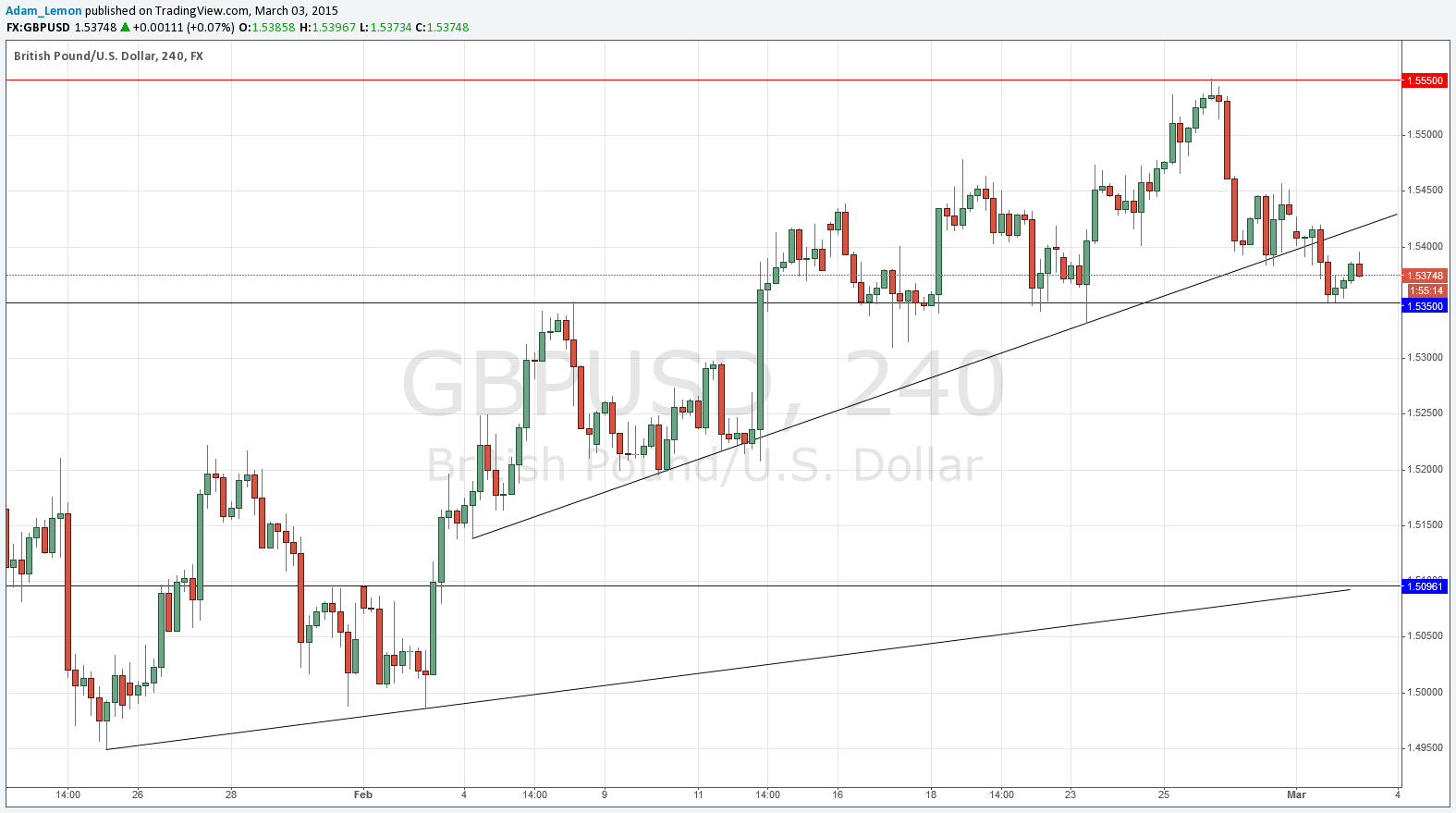 I forecasted yesterday that the horizontal level at 1.5350 was likely to prove to be supportive, and so it was, although so far the move up from there has been quite weak. The picture is complicated by the broken bullish trend line at 1.5416 which could get in the way of any move up from here. As we have just been at 1.5350 I am not looking to get long again there yet. The biggest opportunity today is likely to be a reversal off the broken trend line which then breaks down through 1.5350. The initial reversal may happen naturally but we are likely to need something bearish in the news events today for the price to break down below 1.5350. This would be a serious reversal to recent GBP strength.