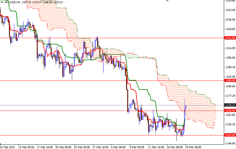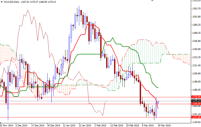 Gold prices ended Wednesday's session up 1.6% as the dollar tumbled after the Federal Reserve downgraded its view of economic activity and indicated that interest rates may rise at a slower pace than anticipated. Gold prices reached $1175.62 an ounce yesterday, the highest level in eight session, before pulling back to $1166 area. While The Federal Reserve removed a reference to being "patient" in tightening, Chair Janet Yellen said "Just because we removed the word patient from the statement doesn’t mean we are going to be impatient...This change does not mean an increase will necessarily occur in June, although we cannot rule that out".