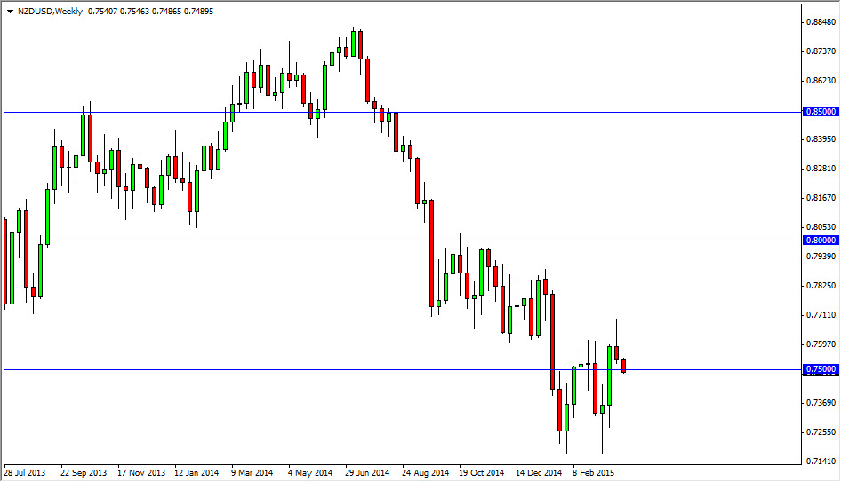 The NZD/USD pair has been all over the place recently, but right now looks as if it’s heading below the 0.75 handle again. With that being the case, I believe that the month of April is going to be fairly bearish for the New Zealand dollar, but I do not expect any type of collapse. In other words, I believe that the market will continue to bang around between the 0.76 level and the 0.72 handle. Ultimately, I do think that we break down below there but I think it’s going to take some time. After all, this market has a history of going sideways for a time and then finally making an impulsive move. You never really know what is going to happen, but right now it just looks like it wants to find some type of sideways action.