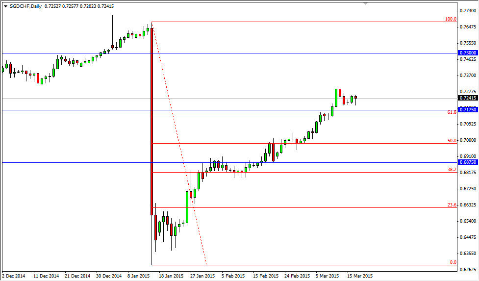 The SGD/CHF pair fell during the course of the session on Tuesday, but found enough support just above the 0.7175 level to turn things back around and form a nice-looking hammer. This hammer is sitting just above the 61.8% Fibonacci retracement level from the massive meltdown that we had seen in this pair due to the Swiss National Bank and its removal of the currency peg and the EUR/CHF pair. Ultimately, this market looks like it has broken above all of the major messages of resistance, and now is free to wipeout the massive meltdown candle that we had seen form. This is the way that the Swiss franc is trading against most currencies, with perhaps the exception of the Euro itself. With that, I believe that the Swiss franc is about to lose significant value against many of the peripheral currencies around the world.