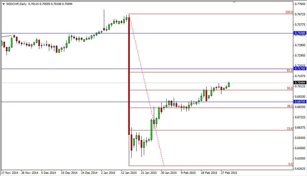 The SGD/CHF pair broke higher during the course of the session on Tuesday, as we cleared the most recent high, as a result it now looks as if we are ready to continue grinding away to the 61.8% Fibonacci retracement level. With that, I believe that this market will continue to grind higher, but not necessarily shoot straight up. With that, I believe that this is a buying opportunity that is going to take a bit of patience, but should continue to climb. The 0.7150 level above will be resistance, so I think that the market will probably struggle to break out above there.