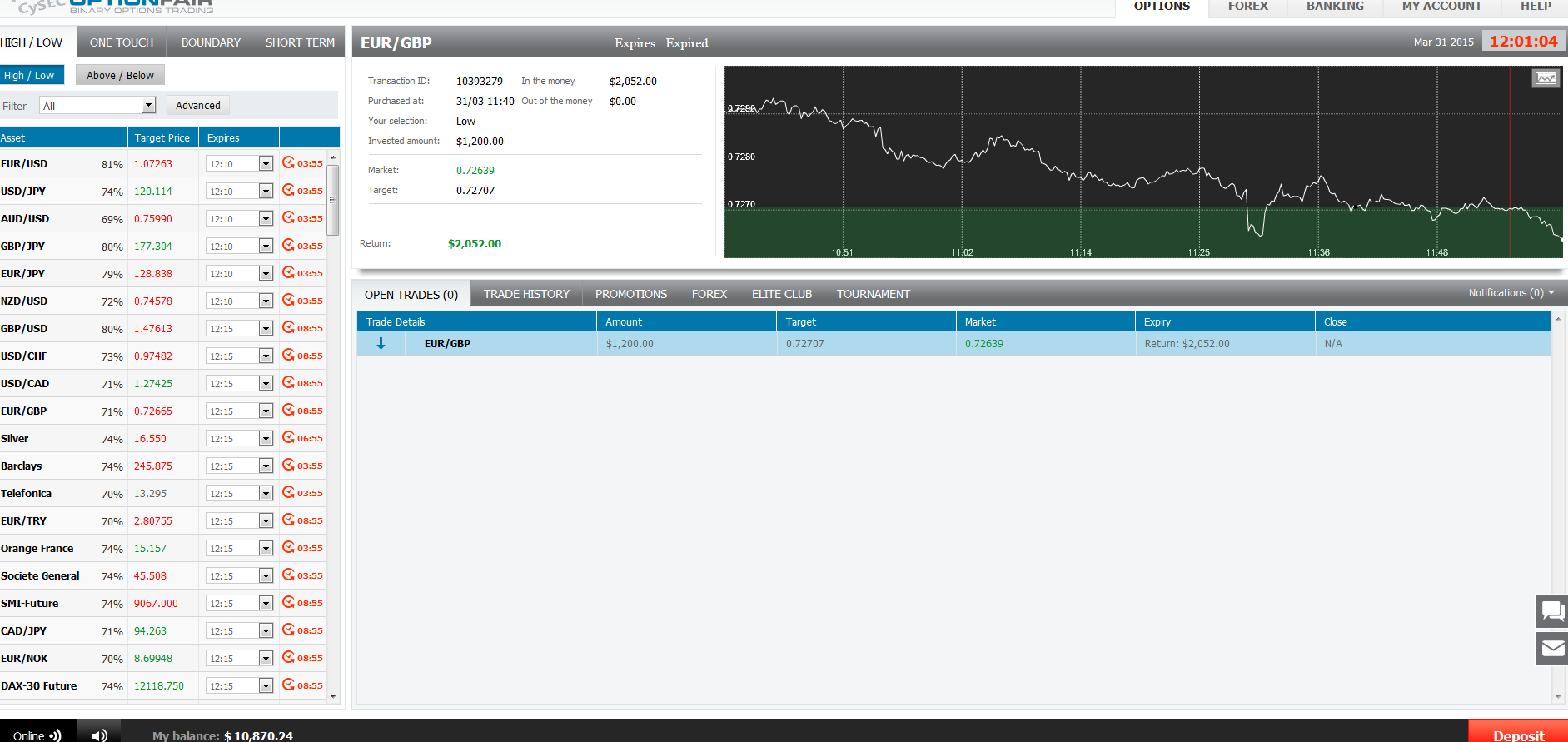 The target price for EUR/GBP at the buying time (11:40) was 0.0.72707 for the expiration of 12:00. The Asset closed on 0.72639 and I made $852.